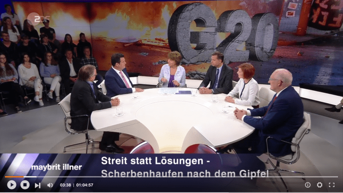 Mit einer unfassbaren Chuzpe ermöglichte Maybrit Illner der dauerhaft verbalauffälligen Katja Kipping, nachdem ihr ein ordentlicher Shitstorm ins Gesicht geweht war und ihre Partei (formerly known as SED) wohl schwere Stimmenverluste befürchtete, sich aus ihrem dummdreisten G20-Kommentar („durch Hamburg marodierende Polizisten“) herauszuwinden. Natürlich habe sie nicht die Polizistinnen und Polizisten gemeint, sondern die Polizeiführung, die „auf Eskalation gesetzt“ habe. „Es gehört zu einer Demokratie dazu“, sagte die, die Demokratie eher als nützlichen Verbalrahmen begreift, „dass man beide Seiten kritisieren dürfe.“ Das hat man auch selten, dass der Tiefpunkt einer Sendung gleich am Anfang steht. Ein wahrlich durchtriebenes Spiel.