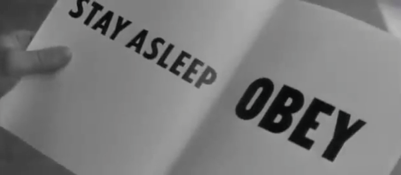 Werbeplakate und Zeitschriften beinhalten nur noch Befehle wie „Gehorche!“, „Konsumiere!“, „Schlafe weiter!“ oder „Sieh fern!“, in einer Zeitschrift sind die Worte „Stelle keine Autoritäten in Frage!“ zu lesen. Neben diesen unterschwelligen Botschaften kommt hinzu, dass viele Personen nicht das sind, was sie ohne Brille vorzugeben scheinen.