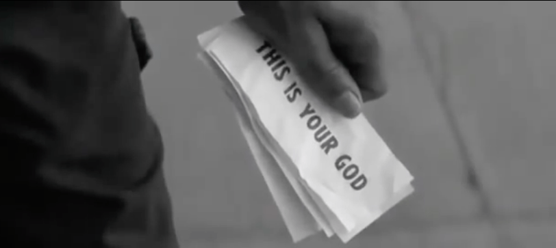 Als er diese tags darauf aufsetzt, sieht er die Welt nicht mehr in bunten Farben und Bildern, sondern nur noch in schwarz-weiß. Das alleine wäre nicht groß verwunderlich. Schockierend entdeckt er durch den Blick der Brille, dass Botschaften hinter allen Werbeplakaten und gedruckten Schildern oder Zeitungen und Zeitschriften stecken. Sogar die Dollar-Noten sind mit einer Botschaft versehen.