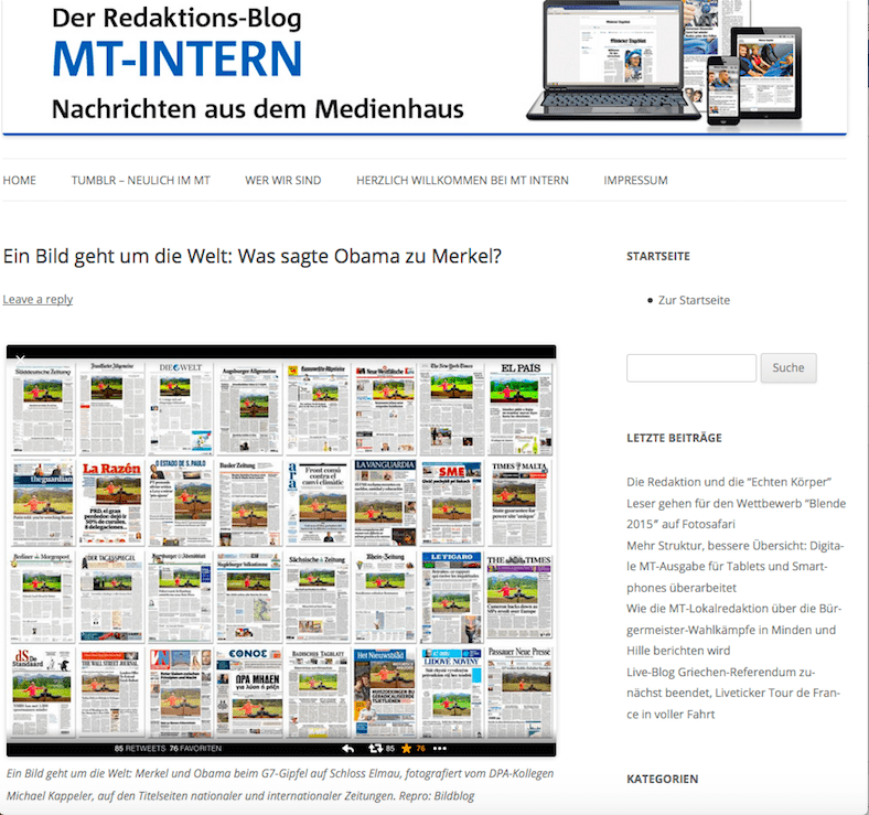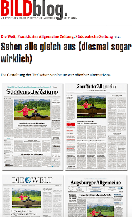 Peter Turnley, Kosovo 1999 http://blog.leica-camera.com/photography/m-system/peter-turnley-moments-of-the-human-condition-part-one/ David Turnley, Golfkrieg I – World Press Photo of the Year 1991 http://www.worldpressphoto.org/collection/photo/1992/world-press-photo-year/david-turnley http://news.bbc.co.uk/2/hi/4290906.stm – die Geschichte des Bildes. Rüdiger Schrader und die »Boris-Hechtrolle« http://www.deutschlandradiokultur.de/tennislegende-bum-bum-boris-und-der-fluch-des-wimbledon.966.de.html Das Foto des weinenden griechischen Rentners: http://visualcultureblog.com/2015/07/the-end-of-the-line/ und die Geschichte zum Bild, das eigentlich aus einer Serie stammt, erzählt von Sakis Mitrolidis: http://blogs.afp.com/correspondent/?post%2Fgreece-eu-debt-viral-thessaloniki-bank-photo-crying-man Die Geschichte hinter dem Obama-Merkel-Foto des G7-Gipfels in Elmau: http://www.mittelbayerische.de/politik-nachrichten/wie-das-merkel-obama-bild-entstand-21771-art1243914.html Und der Titelseitenvergleich: http://www.bildblog.de/65528/sehen-alle-gleich-aus-diesmal-sogar-wirklich/ und http://www.mindenertageblatt.de/blog_mt_intern/?p=12238 Taslima Akter und das tote Paar in der eingestürzten Textilfabrik: http://www.spiegel.de/panorama/gebaeudeeinsturz-in-bangladesch-ein-bild-geht-um-die-welt-a-900487.html http://www.worldpressphoto.org/people/taslima-akhter ©HeikeRost.com 13.7.2015 – Alle Rechte vorbehalten.