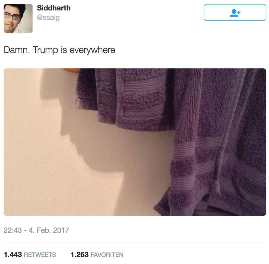 Eingeladen wurde Ina Ruck, Leiterin des Studios Washington der ARD. Zuletzt retweetete sie via Twitter: „ Damn. Trump is everywhere“ und dazu ein Foto eines Herrn Siddharth, der in seinem Badezimmer unter einem Frotteehandtuch in feministischem Lila Donald Trump entdeckt und gleich für die Welt und für Ina Ruck fotografiert hatte.