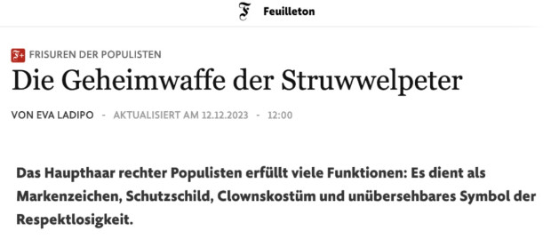 Die Zuteilung der Plätze fiel nicht leicht. Natürlich spielt Subjektivität eine Rolle, ähnlich wie bei der Punktevergabe im Eiskunstlauf. Aber in der Gesamtwertung überzeugt dann doch ein Beitrag der Frankfurter Allgemeinen Zeitung über das Haupthaar rechter Populisten (also nicht zu verwechseln mit ihrem nicht öffentlich zu sehenden Haar). In der Betrachtung geht es um die Frisuren des neuen argentinischen Präsidenten Javier Milei, des früheren US-Präsidenten Donald Trump, des niederländischen Politikers Geert Wilders und den Schopf des britischen Ex-Premiers Boris Johnson.