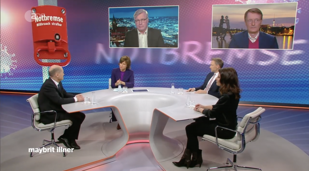 Ich hatte zu Beginn wenigstens die – wenn auch sehr sehr unwahrscheinliche – Möglichkeit in Betracht gezogen, dass diese Fragestellung vielleicht eine Art selbstironischer Scherz sein könnte, doch dann habe ich gesehen, dass Karl Lauterbach zu den Gästen zählt … Zwar wird in der Sendung nicht NUR die Frage gestellt, ob die Notbremse zu spät kommt, sondern auch ob sie gerechtfertigt ist, aber die Einstellung der Redaktion ist ziemlich eindeutig. Dieser Verdacht erhärtet sich, als Illner folgender Satz zum Thema Gesetzesentwurf rausrutscht: „Ich glaube jeder Mensch in diesem Land drückt den Daumen, dass das jetzt nicht auch noch vor dem Verfassungsgericht scheitert“.