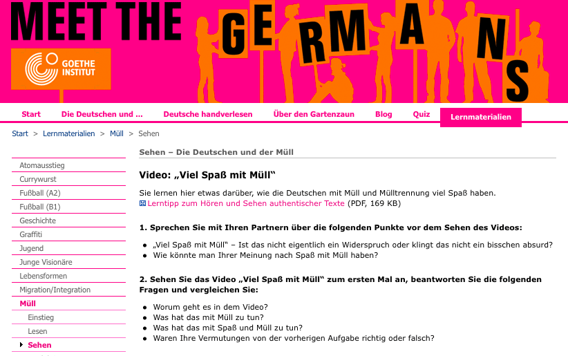 „Sie lernen hier etwas darüber, wie die Deutschen mit Müll und Mülltrennung viel Spaß haben. „Viel Spaß mit Müll“ – Ist das nicht eigentlich ein Widerspruch oder klingt das nicht ein bisschen absurd? – Wie könnte man Ihrer Meinung nach Spaß mit Müll haben?“