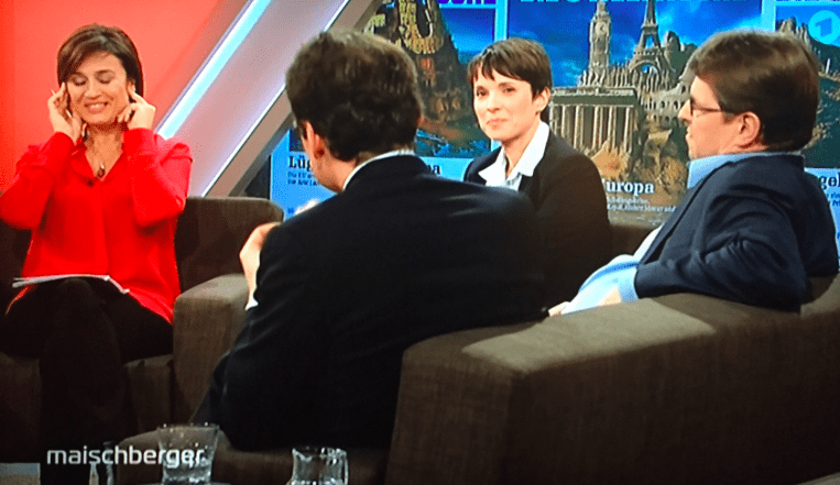 Und es wird Sekunde für Sekunde mieser. Maischberger schulmeisterlich zu Petry, „Wir werden das jetzt nacheinander abarbeiten“ (Sie meint die Zitat-Videoeinspieler). Nur leider kommt Petry gar nicht dazu, sich zu irgendetwas zu äußern, weil sie einfach ständig unterbrochen wird.