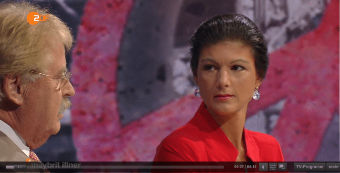 „Verschwörungstheorie“ schimpfte Elmar Brok, der für CDU und EU am Tisch saß, und Schnappatmung bekam wie einst Deutschlands bester Journalist Horst Schlämmer. „Mit Ihren paar Prozentpunkten kriegen Sie reichlich viel Redezeit!“ „Über Prozente sollten Sie besser nicht reden,“ konterte die rotgewandete Sahra. „Bis 2004 haben Sie mit Assad noch als Partner kooperiert.“ Und die Partner Saudi-Arabien und Iran seien ja auch feine Freunde, was Menschenrechte angeht. Man habe zu viel mit Diktatoren gemacht, räumte Brok ein, aber in Syrien hätten sie nicht eingreifen dürfen, wegen des UN-Vetos der Russen. Als könne die EU, unfähig die eigenen Grenzen zu schützen, irgendwo „eingreifen“.