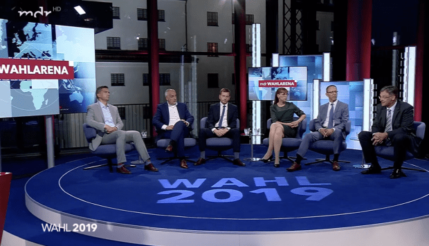 Mit der Drohung dieser wackeren Musikkapelle machte also der MDR sein Publikum heiß auf da große Fernsehereignis des Abends: die Wahlarena. Die Spitzenkandidaten der fünf größten Parteien traten gegeneinander an und sollten, moderiert von MDR-Moderatoren Uta Dekor und Gunnar Breske, auf Fragen aus dem Publikum antworten, um ihre Positionen deutlich zu machen. „Bürgercheck“ nennt es der MDR, im Journalistenjargon heißt so etwas „Elefantenrunde“.