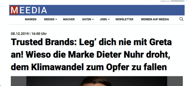 „Und genau an dieser Stelle wird sich nun entscheiden, ob die PR im Sinne der Marke Dieter Nuhr wirklich gute PR war. Eines ist ziemlich klar: Greta hat für eine der wichtigsten Bewegungen der Geschichte gesorgt. Die ‚Marke Fridays for Future’ ist ganz sicher wertvoller und mächtiger als die Marke Dieter Nuhr. Und in seiner Klientel am Ende wohl auch ein bisschen populärer. So lautstark gegen Greta anzustänkern — das mag sich trotz aller Gratis-Publicity langfristig als Maßnahme herausstellen, die der Marke Nuhr massiv geschadet hat.“