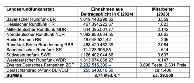 Rechnet man die 8,74 Milliarden Euro herunter, so ergeben sich pro Monat 728 Millionen, pro Woche 168 Millionen und pro Tag 24 Millionen Euro. Allein der „Beitragsservice“ mit seinen rund 930 Mitarbeitern verschlingt 172,4 Millionen Euro im Jahr (Stand: 2022).