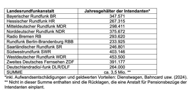Unabhängig von der Höhe der Zwangsgebühr gilt: Der ÖRR ist erstens verfettet, er feudalisiert – zweitens – seine Intendanten und „Stars. Und er ist – drittens – der kostspieligste der Welt.