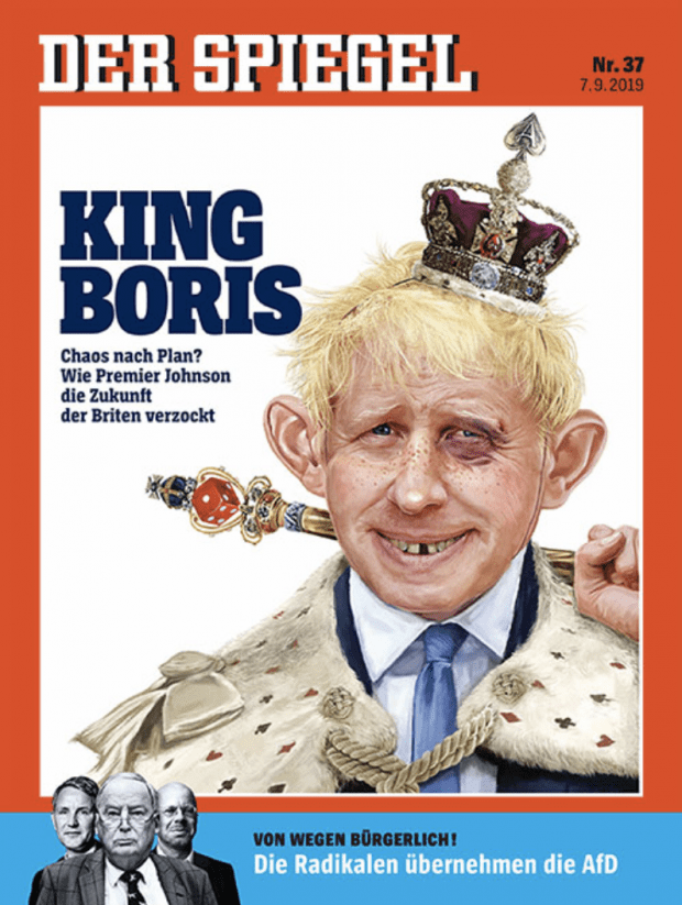 Der Spiegel hebt ein zweites Mal innerhalb weniger Wochen Boris Johnson im MAD-Stil mit Zahnlücke und irrem Blick auf sein Cover: „Wie der Premier Johnson die Zukunft der Briten verzockt.“
