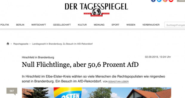 Zur schönen Medientradition in Deutschlands gehört der Brauch, nach einer Wahl – vor allem dann, wenn sie nicht zur Zufriedenheit der Berliner und Hamburger Redaktionen ausgefallen ist – einen Ort herauszusuchen, in dem besonders schlimm gewählt wurde, Journalisten auf Tagesexkursion hinzuschicken und zu berichten, wie es so weit kommen konnte. Nach den Wahlen in Sachsen und Brandenburg fiel die Wahl auf das brandenburgische Dorf Hirschfeld an der Grenze zu Sachsen. „AfD-Rekorddorf Hirschfeld – Null Prozent Flüchtlinge, aber 50,6 Prozent AfD“, titelte der „Tagesspiegel“ am 2. September.