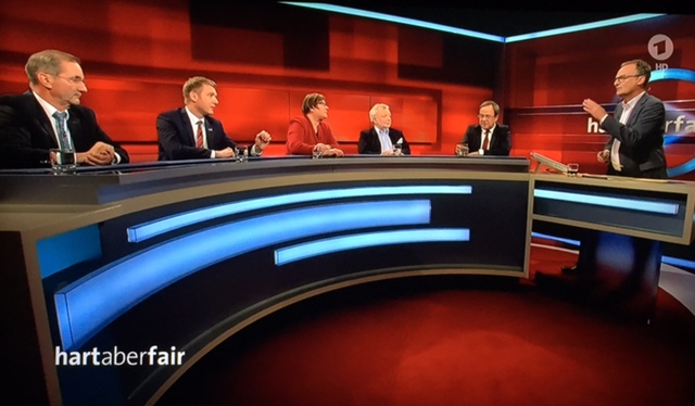 Plasberg eröffnet mit der Feststellung, dass es in Dresden eine hemmungslose Verachtung der Politiker gegeben hätte. Nur in Dresden? Ähm, also in Braunschweig manchmal auch. Sogar hier am Schreibtisch des Autors dieser TV-Berichterstattung. Aber weiter. „Spießrutenlaufen für die Spitze des Staates in Dresden ausgerechnet am Tag der deutschen Einheit?“ fragt Plasberg den Platzeck. Der hätte sich geschämt, erklärt er, wolle aber gerne bis zum Lebensende Ostdeutscher bleiben, das läge bei ihm nun Mal in den Genen. Tja, für Sarrazin lag ja auch einiges in den Genen. Aber das ist wieder ein ganz anderes Thema. Viel mehr erinnert Platzeck die Republik vor dem Bildschirm noch einmal daran, dass die Wende für viele Ostdeutsche auch ein Zusammenbruch war. Und es hätte noch nie einen solchen Exodus seit dem 30-jährigen Krieg gegeben, wie den der Kinder der DDR Bürger, die in den Westen gingen. Und die Westler sollen sich doch mal vorstellen, wie sie das fänden, wenn bei Ihnen 90 Prozent der Führungseliten Ostdeutsche wären. Hier muss man sich allerdings als genetischer BRDler wundern, wenn man an die neue BRD-Spitze, an die Ostdeutschen Merkel und Gauck und auch an Katrin Göring-Eckardt denkt.