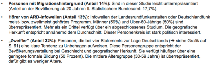 Zusätzlich betrachtet in der Repräsentativ-Studie wurden bei der Auswertung Teilgruppen, „bei denen sich durchgängig (zum Teil deutliche) Unterschiede zum Bevölkerungsmittel feststellen lassen.“ Die Beschreibung dieser Gruppen ist schon selbst eine Bewertung: