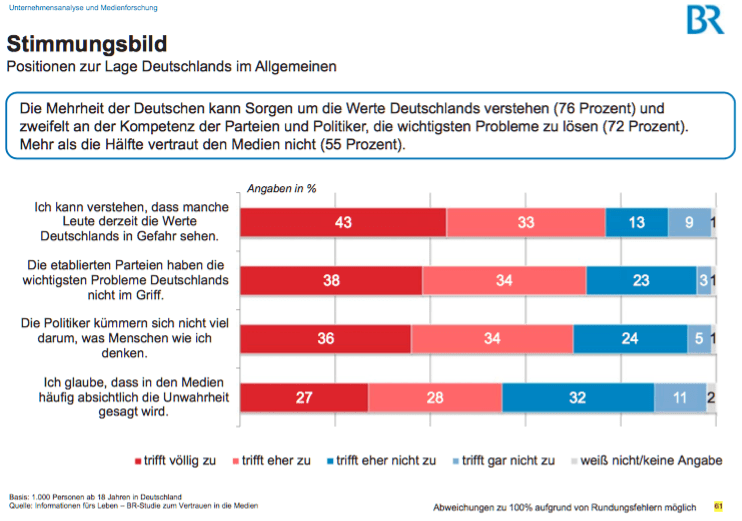 Wesentliches verpasst, wer die Abteilung Methodisches ignoriert und daher nicht erfährt, dass es sich um zwei separate Studien handelt, eine Deutschland-weite Repräsentativbefragung vom 11. März bis 2. April 2016 durch das Institut TNS emnid, Bielefeld und eine qualitative Untersuchung mit vier Fokusgruppen mit Nachrichtennutzern in München und Nürnberg am 8. und 14. März 2016 durch das Institut Klare Antworten, München. Ausgewertet hat die Ergebnisse der Bayerische Rundfunk selbst.