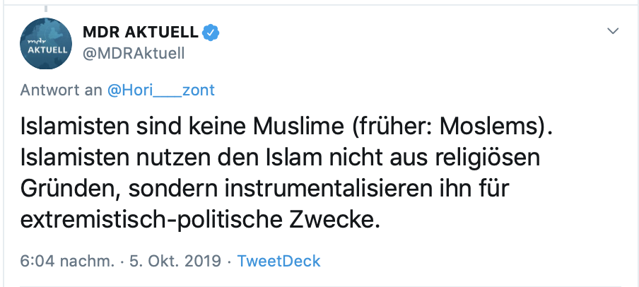 „Islamisten sind keine Muslime“, berichtet MDR aktuell. Denn: „Islamisten nutzen den Islam nicht aus religiösen Gründen.“