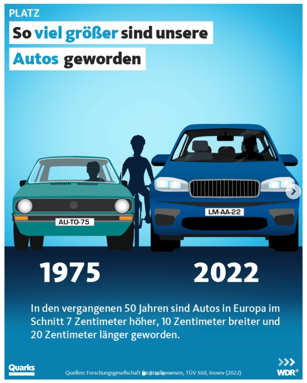 Fast immer steckt eine erzieherische Absicht hinter dem alternativen Umgang mit Zahlen. Bei der WDR-Wissenschaftssendung Quarks sogar immer. Im April erläuterte das Magazin seinen Zuschauern, wie Autos zwischen 1975 und 2022 durchschnittlich an Höhe sieben und in der Breite zehn Zentimeter zugenommen hätten, wodurch sie immer mehr Platz im Verkehrsraum beanspruchen. Auf der Grafik dazu zeigen schon die Nummernschilder und der eingequetschte Radfahrer in der Mitte, dass die Redaktion diesen Größenzuwachs als sehr problematisch ansieht.