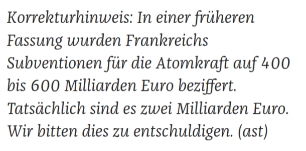 Die Journalistin Annika Joeres erklärte in einem Text unter der Überschrift „In der Atomfalle“, wie sich Frankreich durch Kernkraft ruinieren würde. Für seine 56 Atommeiler, rechnete sie vor, gibt Frankreich „400 bis 600 Milliarden Euro“ Subventionen pro Jahr aus. Schon die Schwankungsbreite von immerhin 200 Milliarden hätte jemanden in der Redaktion stutzig machen müssen, spätestens aber der Blick auf den französischen Staatshaushalt. Sechshundert Milliarden wären mehr als ein Drittel des Etats von 2023 (1,597 Billionen Euro). Immerhin korrigierte das Blatt dann später klein unter dem Online-Beitrag die Zahl auf die tatsächliche Subventionshöhe, nämlich sehr viel bescheidenere zwei Milliarden Euro jährlich.