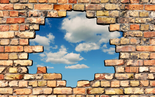 Loch in der Ziegelwand mit Wolkenhimmel im Hintergrund Symbolbild zum Thema Freiheit *** Hole in the brick wall with a c Published on 14. September 2024 in Die Forderung einer Brandmauer konterkariert die gelebte DemokratieFull resolution (620 × 388) Next →