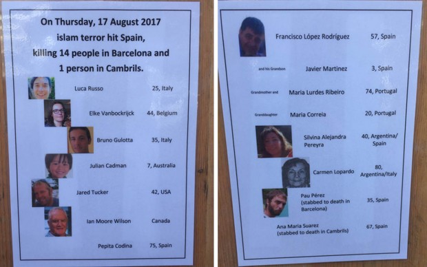 Seit einigen Tagen befindet sich an dieser provisorischen Gedenkstätte ebenfalls ein Hinweis auf den Terroranschlag in Barcelona vom 17. August 2017, bei dem siebzehn Menschen ermordet wurden.