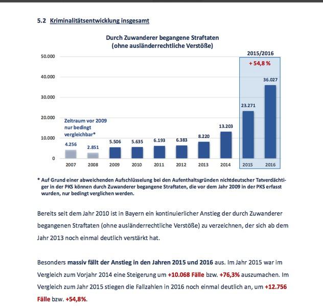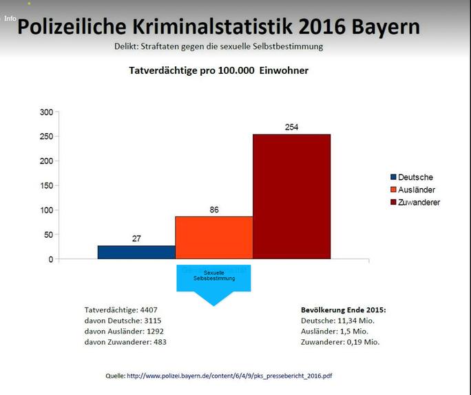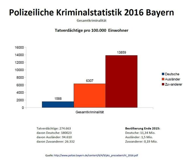 Der Faktor zwischen Deutschen und Zuwanderern beträgt 8,7. Zuwanderer waren 2016 in Bayern mithin fast neun Mal krimineller als Deutsche.
