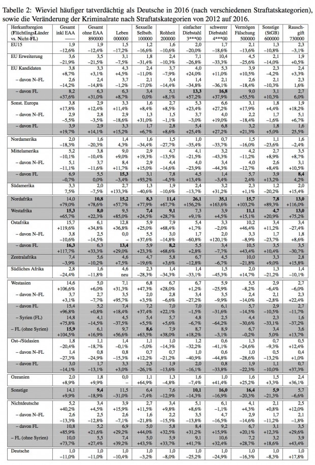Der Wert in der Tabelle wäre in diesem Fall 10,0 bei Nordafrikanern und 1,0 bei Deutschen. Die drei höchsten Werte je Straftatskategorie wurden hervorgehoben.