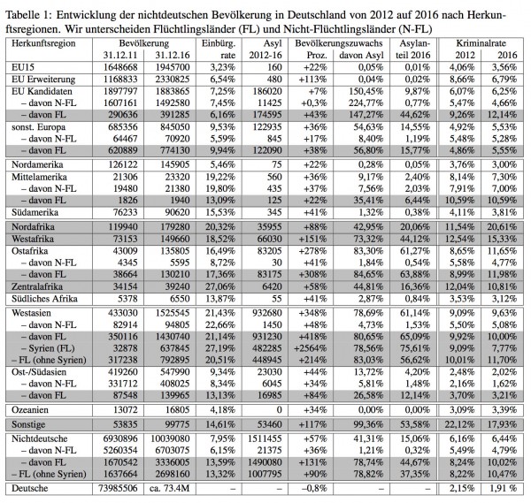 Anhand der Polizeilichen Kriminalstatistik, der Bevölkerungsstatistik und der Asylstatistik untersuchen wir, wie sich die Kriminalität in Deutschland in den letzten fünf Jahren entwickelte. Wir unterscheiden dabei nach Ländern aus denen viele Flüchtlinge stammen und Ländern aus denen wenige bis keine Flüchtlinge stammen. Außerdem gruppieren wir diese Länder in verschiedene Weltregionen und unterscheiden nach verschiedenen Straftatskategorien. Die Ergebnisse sind eindeutig und lassen keine Zweifel offen.