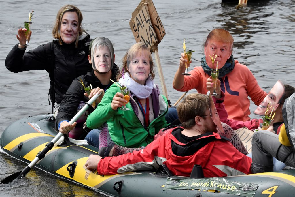 Protestors with masks of politicians (L-R) EU Foreign minister Frederica Mogherini, British Prime minister Theresa May, German Chancellor Angela Merkel, US President Donald Trump and Russian President Vladimir Putin drink cocktails in a boat on the Alster river during a demonstration called by several NGOs ahead of the G20 summit in Hamburg on July 2, 2017