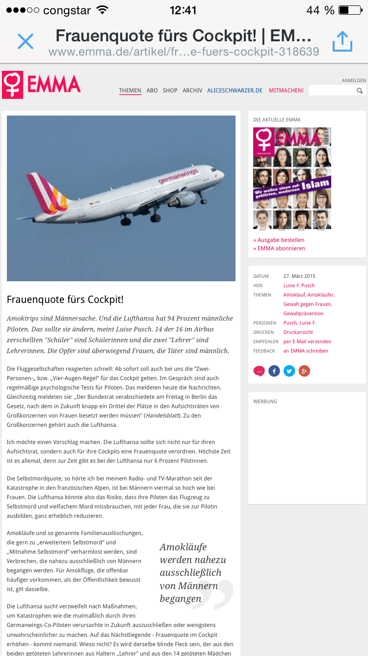 IMG_0083 28. März 2015Full resolution (750 × 1334) ← Previous Next → Der garantiert dümmste Beitrag zur Katastrophe stammt von EMMA: Auf dem Feuerchen der Katastrophe wird das billigste politische Geschäftchen gekocht.