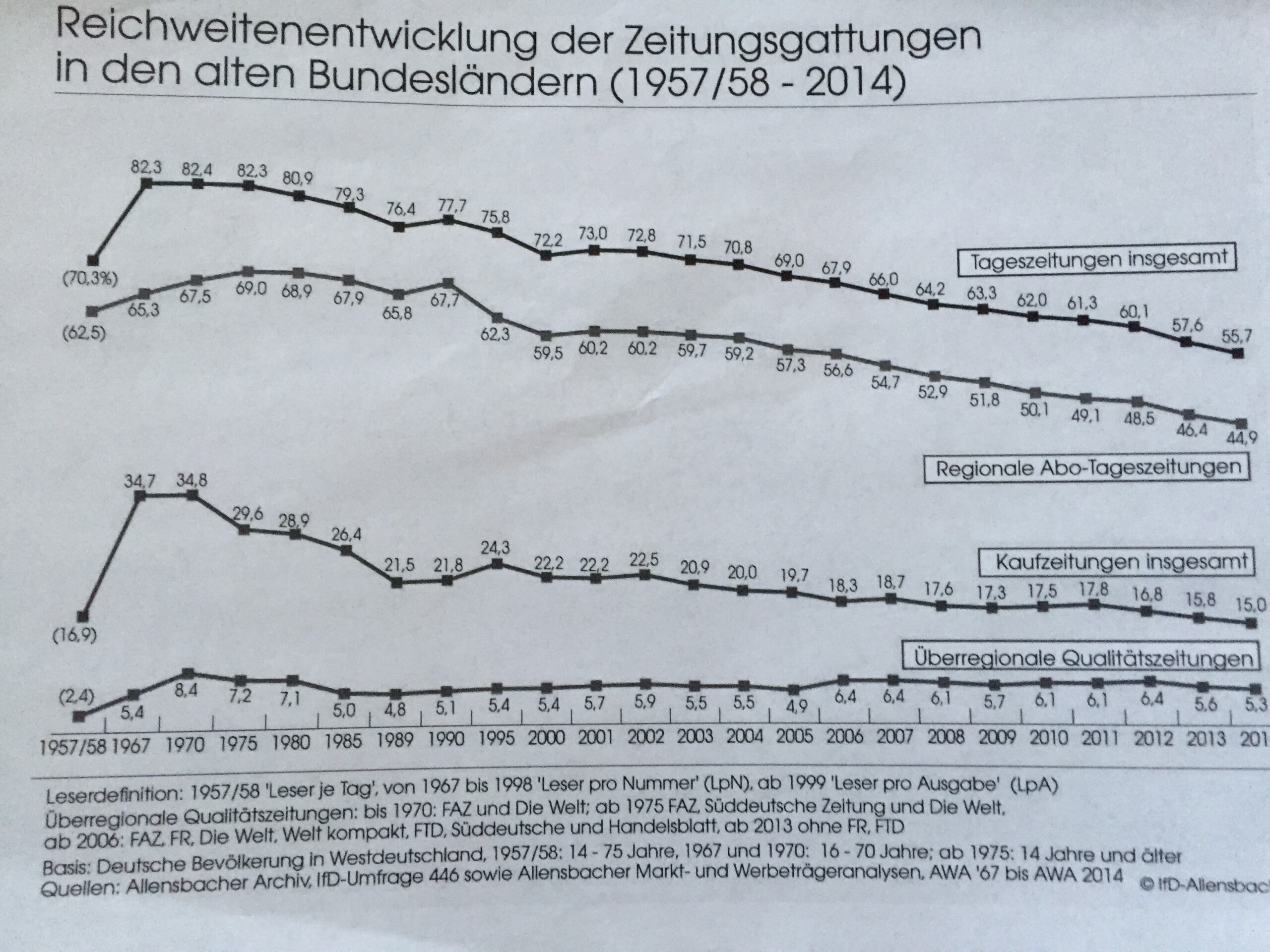 IMG_1667 2 10. Mai 2015Full resolution (2560 × 1920) ← Previous Next → Es geht schon lange bergab: Reichweiten von Tageszeitungen. Quelle: Kepplinger