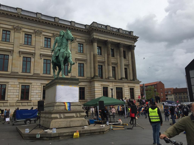 Bereitwillig erzählt uns der Beamte, dass vor dem Schloss und auf dem Burgplatz für heute gleich mehrere Demonstrationen angemeldet seien. Zwei hätten auf dem Burgplatz bereits begonnen, eine von der Partei Die Rechte mitten auf diesem historischen Platz mit seinem Braunschweiger Löwendenkmal und eine weitere als Gegendemonstration aufgeteilt auf zwei – der Zugangsbereich hin zum Burgplatz.