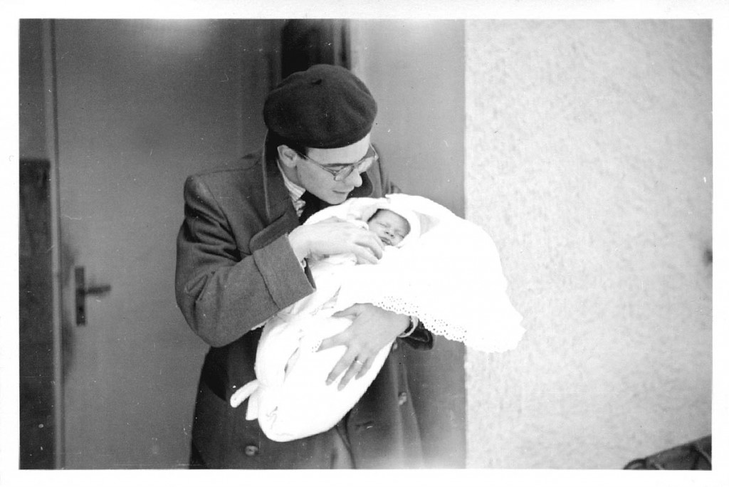 Par Mail sendet Susanne Elten ein Schwarzweißfoto. Zu sehen ist darauf der Vater im modernen Tweedmantel mit Baskenmütze auf dem Kopf und dickrahmiger Brille, wie er gerade neugierig auf das Gesicht seiner Tochter schaut, welche da in einem Laken- und Tücherpaket vor Kälte geschützt liegt. Schon zwei Jahre später wird er die junge Familie verlassen. Susanne stammt aus erster Ehe.