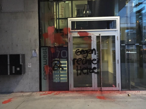 Große rote Kleckse, auf der Glastür ein gesprühtes Hammer-und-Sichel-Symbol und die Worte „Gegen rechte Hetze“ – so präsentiert sich der Eingang des Redaktionsgebäudes der „Weltwoche“ in Zürich derzeit. Auf dem Boden zerfließen blutrote Pfützen. Offenbar linksextreme Täter haben Mitte der Woche den Farbanschlag verübt.