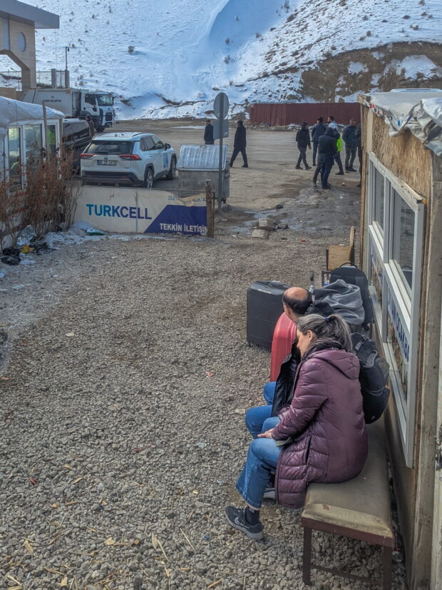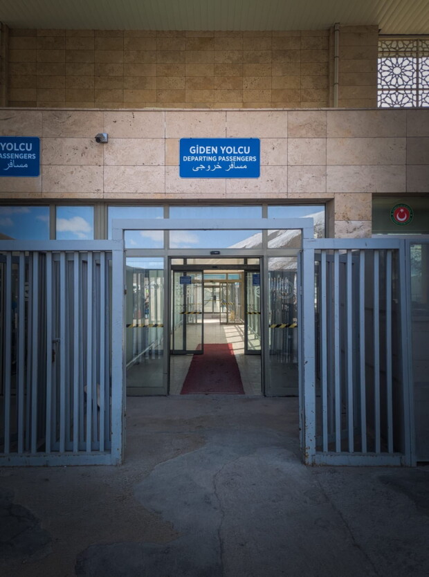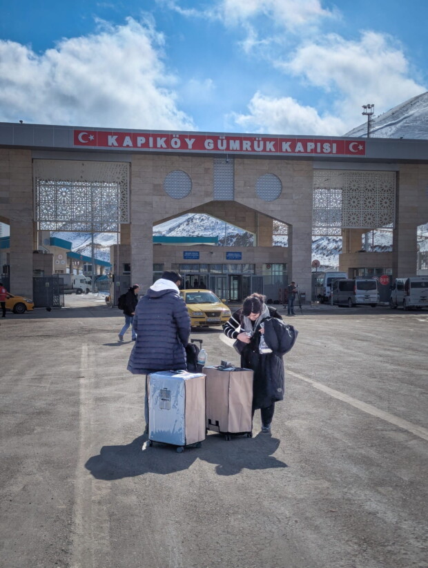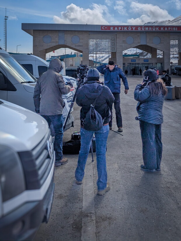 Vor dem großen orientalisch-ornamental verzierten Grenzportal sammeln sich die weißen Kleinbusse in kleinen Pulks. Fahrer sprechen die Ankommenden an und bieten Fahrten nach Van an. Die Stimmung wirkt gelöst, professionell und geübt geschäftig. Türkische Sicherheitskräfte sind zwar präsent, schauen nach dem Rechten, halten sich aber auffallend zurück. Kurz werde ich gefragt, für welches Medium ich unterwegs bin. Der junge Grenzer lächelt, salutiert und verabschiedet sich mit einem „Good Luck“. Immerhin ist er nicht enttäuscht, dass er Wallasch und Tichy nicht kennt.