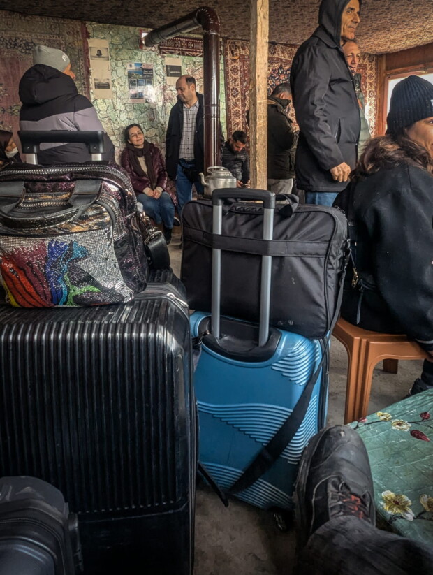 Am türkisch-iranischen Grenzübergang selbst herrscht ein gemächliches Kommen und Gehen. In der teppichbehangenen Teestube sitzt mit mir ein gutes Dutzend Reisende aus dem Iran. In der Mitte bollert ein Kanonenofen. Frauen mit Hund, Familien mit Kindern, Menschen mit schweren Taschen lassen sich zwischen Rollkoffern und Rucksäcken auf Fensterbänken oder kleinen Hockern nieder und warten auf ihre Busse oder Taxis, die draußen in langen Reihen stehen. Ist das schon der Beginn des befürchteten großen Trecks über die Türkei in Richtung Europa? Viele Frauen reisen mit ihren Müttern oder Familien, meist westlich gekleidet, oft ohne Kopftuch. Kinder laufen zwischen den wartenden Gruppen umher. In einem regelmäßigen Rhythmus, etwa alle dreißig Minuten, kommen neue Gruppen von der iranischen Seite herüber – jeweils dreißig bis fünfzig Menschen. Wer hier schon beginnt hochzurechnen, für den könne sich die Summen schnell zu einem Problem auftürmen. Aber für wen?