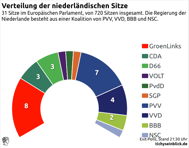 Gleichzeitig verliert die Kombination Grüne Linke/PvdA, Grüne, Sozialdemokraten (GroenLinks) im Vergleich zu 2019 einen Sitz – bei wachsender Mandatszahl gleich eine doppelte Niederlage. Angeführt vom ehemaligen EU-Kommissar Frans Timmermans, zieht die fusionierte Partei bei EU-Wahlen normalerweise mehr Wähler an die Urnen als die meisten anderen Parteien. Umso bitterer ist es für sie, dass sie trotz des heftigen Widerstands gegen die einwanderungsgegnerische niederländische Regierung von Wilders keine Zugewinne, sondern sogar Verluste hinnehmen musste. GroenLinks steht damit bei acht Sitzen – einer mehr als Wilders PVV, aber weniger als Wilders und seine Koalitionspartner zusammen erreichen konnten. Ein knapper Sieg nach Punkten.