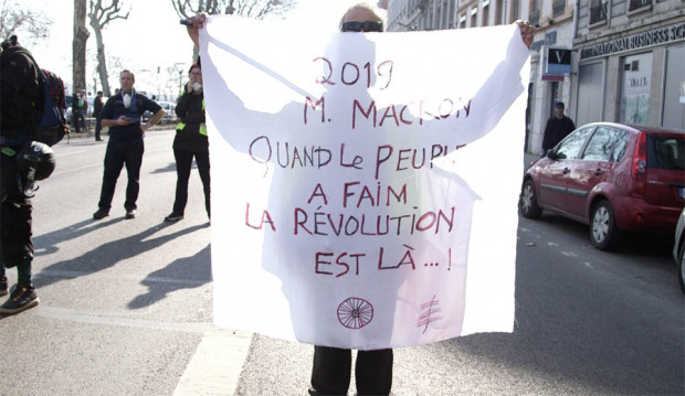Rentner Alain mit seinem Banner : “Monsieur Macron: Wenn das Volk hungert, gibt es die Revolution”