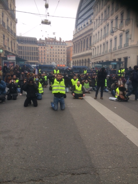 Noch ist es friedlich auf der “Place Bellecour”. Die Gelbwesten laufen im Kreis, gegen 15 Uhr öffnen die Sicherheitskräfte dann doch ein Schlupfloch und lenken den Protestzug über die Uferstraße der Rhône in die Innenstadt. Die Gelbwesten wollen zum Rathaus, zur “Place des Terreaux”, um dort ihrem Unmut Ausdruck zu verleihen. Doch die Rechnung geht nicht auf: Noch vor der Ankunft auf der Geschäftsstraße “Rue de la République“ teilen die Sicherheitskräfte die Demonstration in zwei Teile. Die eine Hälfte erreicht die “Place des Cordeliers“, von dort aus sind es nur noch wenige hundert Meter bis zum Rathaus. Wer gemeint hat, der Rest gehe nun ganz einfach, der hat sich geirrt. Erste Tränengas-Granaten fliegen. Die Polizei will die Demonstration zunächst zersplittern, dann ganz auflösen.