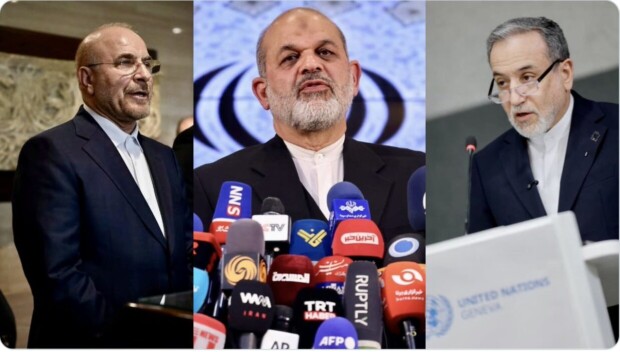 Laut Iran International vom 20. April habe der Sprecher des iranischen Parlaments Ghalibaf den Sekretär des Obersten Nationalen Sicherheitsrates Saeed Jalili und den Abgeordneten Amirhossein Sabeti intern als „extremistische Milizen, die den Iran zerstören wollen“ bezeichnet. Vahidi sich in derselben Woche über Außenminister Araghchis Erklärung hinweggesetzt, die Grenze zu Hormuz sei geöffnet, indem er Tanker beschießen ließ. Das Staatsfernsehen nannte Araghchi einen Idioten. Vahidi versuchte, Zolghadr in die Islamabad-Delegation einzuschleusen. Die Delegation verließ Islamabad am 11. April.