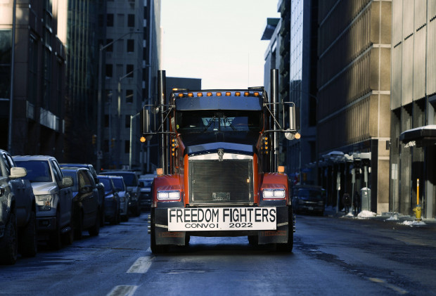January 31, 2022, Ottawa, Canada: A truck is parked on Albert Street as a rally against COVID-19 restrictions, which began as a cross-country convoy protesting a federal vaccine mandate for truckers, continues throughout downtown Ottawa, on Monday, Jan. 31, 2022.