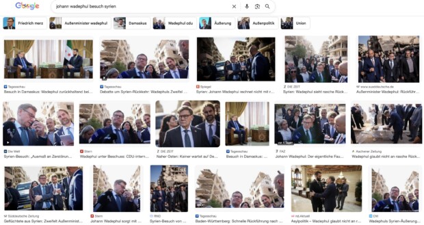 Interessant ist jedoch folgender Gegensatz, während in der Provinz Rif Dimashq, die Damaskus umgibt, die Infrastruktur zu 61 % zerstört sein soll, gilt das eben nicht für Damaskus. Und so steht zu vermuten, dass die syrischen Gastgeber dem italienischen Außenminister, mit dem die Syrer über wirtschaftliche Zusammenarbeit und die Ansiedlung italienischer Firmen sprachen, die unzerstörte Altstadt zeigten, während sie den deutschen Außenminister, von dem sie nur deutsche Steuermilliarden erwarten, aus der Stadt herausfuhren, um mit ihm einen Ruinen-Tour zu unternehmen. Auch Wadephuls Vorgängerin und Leitstern Annalena Baerbock ließ sich zu verschiedenen Besuchen gerne durch solche zerstörten Vororte wie Dschubar fahren, um die passenden Fotos für Daheim zu produzieren, nach dem Motto: Seht her, hierher kann man doch niemanden zurückschicken, seid ihr denn des Wahnsinns fette Beute?!