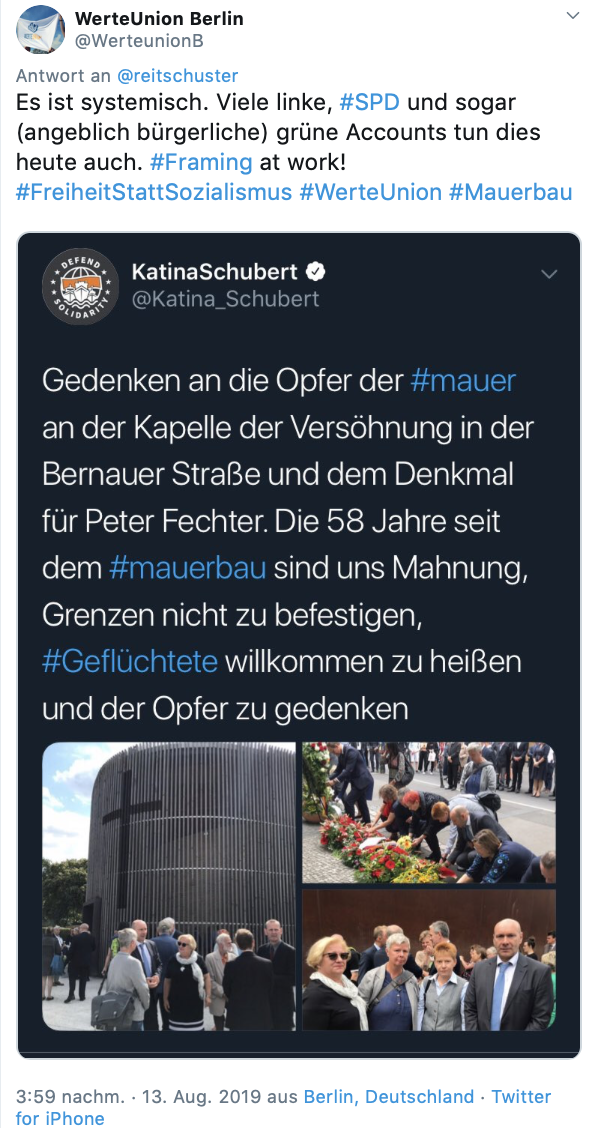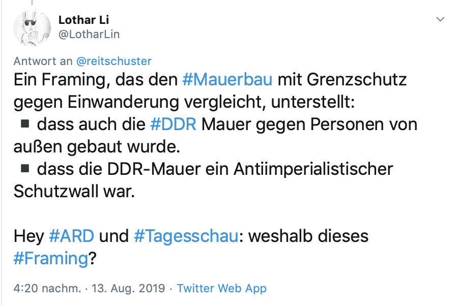 Dafür gab es Framing mit dem Holzhammer: Die Mauer, mit der linke Gewaltherrscher Millionen Menschen im eigenen Land einsperrten, wurde verglichen mit dem Grenzschutz etwa der USA gegen illegale Einwanderer oder der Mauer in Israel, mit der sich der Juden-Staat vor Terror zu schützen versucht. Das ist, wie wenn man eine Gefängnis- mit einer Haustüre gleichsetzt. Der Tenor des ARD-Beitrags, ausgerechnet mit Berlins regierendem Bürgermeister Michael Müller von der SPD als Kronzeuge: Das DDR-Bauwerk, an dem 136 und 245 Menschen ums Leben kamen, sei ein Mahnmal gegen Grenzschutz! Das ist schamlose Verfälschung und Missbrauch der Geschichte für die eigene linke Ideologie der offenen Grenzen auf Kosten der Gebührenzahler. Und eine Verhöhnung der Mauertoten.
