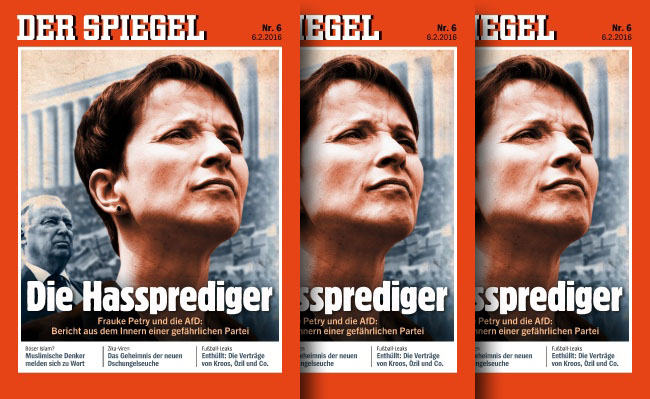 Der SPIEGEL schwingt in dieser Woche die große Keule und stürzt sich auf die AfD. Das Titelbild stellt Frauke Petry gleich mit Hitler, und Gauland ist der Stellvertreter – vor der Kulisse des Reichsparteitags. Und dazu das große, alles erschlagende Wort „Hassprediger“. Das ist geschichtsvergessen. Das ist kein Journalismus. Das ist Propaganda.
