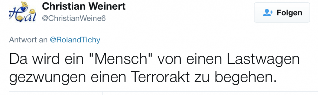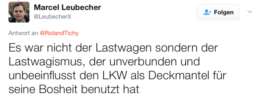 Dazu passt ein liebedienerisches Stück über das Internetzensurgesetz unseres famosen Meinungswarts im Amt des Bundesjustizministers. Man spürt förmlich das Verlangen, dass endlich jene Medien an die Leine gelegt werden, in denen noch über die Hintergründe von Vorfällen berichtet wird und in denen in Zweifel gezogen wird, dass der ‚Lastwagenismus‘ (s.u.) wirklich für die Morde von Stockholm, Berlin und Nizza verantwortlich ist. Wieso sollen andere schreiben dürfen, was man selbst nicht schreiben mag und dabei ist, an der eigenen PC zu ersticken wie an einer fauligen Fischgräte? Unsere Twitter-Show zeigt den fröhlichen Spott über verklemmte Redakteure, die schwer an ihrer Verantwortung für das Gedeihen der staatlich verordneten Politik tragen. Die Selbstzensur soll durch die Staatszensur abgerundet werden.