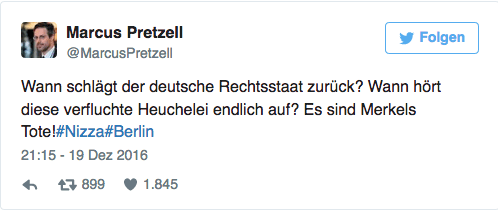 Der Terroranschlag auf dem Berliner Breitscheidplatz wurde gegen 20 Uhr begangen. Als die Rettungskräfte noch alle Hände voll zu tun hatten, twitterte um 21:15 Uhr Marcus Pretzell, Sprecher der AfD in Nordrhein-Westfalen: