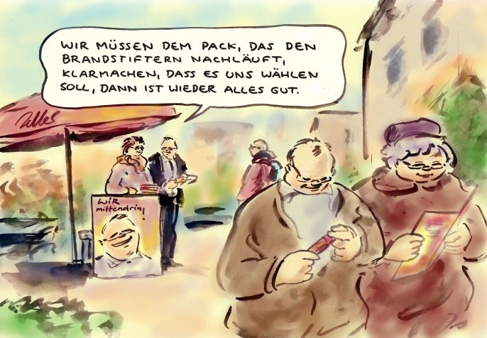 Die Etablierten finden vor allem deshalb keine neuen Antworten, weil sie die nicht für nötig halten. Sie überlassen alles Handeln in einer auffällig unerwachsenen, erschreckend obrigkeitsgläubigen und untertänigen, vielleicht auch bloß bequemen und feigen Flucht vor der Verantwortung der Kanzlerin allein. Sie verschließen – wie der SZ-Bericht – ihre Augen davor, dass so viele ihr Kreuz nur deshalb bei der AfD machen wollen, um Merkel und die Bundestagsparteien abzuwählen. Die Etablierten und die meisten Meinungsführer-Medien haben sich total in der Sackgasse eines einzigen Rezepts zum Thema AfD verrannt: diese ins moralische Abseits zu stellen.