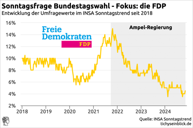 2024-11-05_FDP-seit-2018_INSA_g Published on 10. November 2024 in Diesmal geht es der Zombie-Partei FDP an den KragenFull resolution (620 × 413) Next →