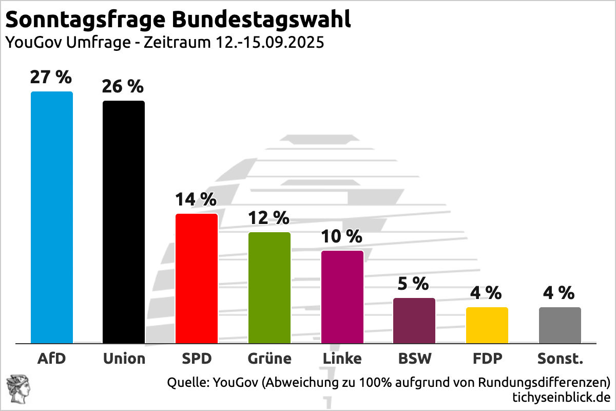 Die Schlagzeilen-Glocke bimmelt, YouGov sendet das Signal: Die AfD liegt mit 27 Prozent erstmals vor der Union mit 26 Prozent.