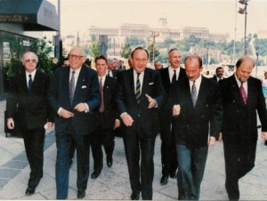 Eröffnung des Büros der Friedrich-Naumann-Stiftung: Botschafter Horvath, Mischnick, Genscher, Goergen, FDP-Sprecher Mahling in Budapest 1989