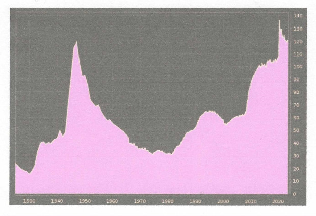 Die Graphik zeigt zunächst (auf der linken Seite) eine steil ansteigende Schuldenquote, die gegen Ende der 1940er Jahre ihren Höhepunkt erreicht – also am Ende des 2. Weltkriegs (einschließlich des pazifischen Kriegsschauplatzes). Diese hohe Verschuldungsquote wird dann relativ rasch wieder abgebaut und beträgt Ende der 1960erJahre nur ein Drittel des Spitzenwerts. Das ist ein bemerkenswertes historisches Beispiel von Schuldenabbau durch Produktivitätswachstum. Doch gegen Ende der 1970er Jahre beginnt ein neuer Anstieg der Schuldenquote, der Mitte der 1990er Jahre ein beträchtliches Niveau erreicht und auf dieser Stufe bis Ende der 2000er Jahre verharrt. Und dann kommt es nicht wieder zu einem Rückgang, sondern zu einem zweiten Anstieg, der Anfang der 2020er einen Höhepunkt erreicht, der sogar über der Schuldenquote der USA am Ende des 2. Weltkriegs liegt. Und das ist nicht nur ein kurzer Höhepunkt, sondern der Beginn einer neuen Stufe.
